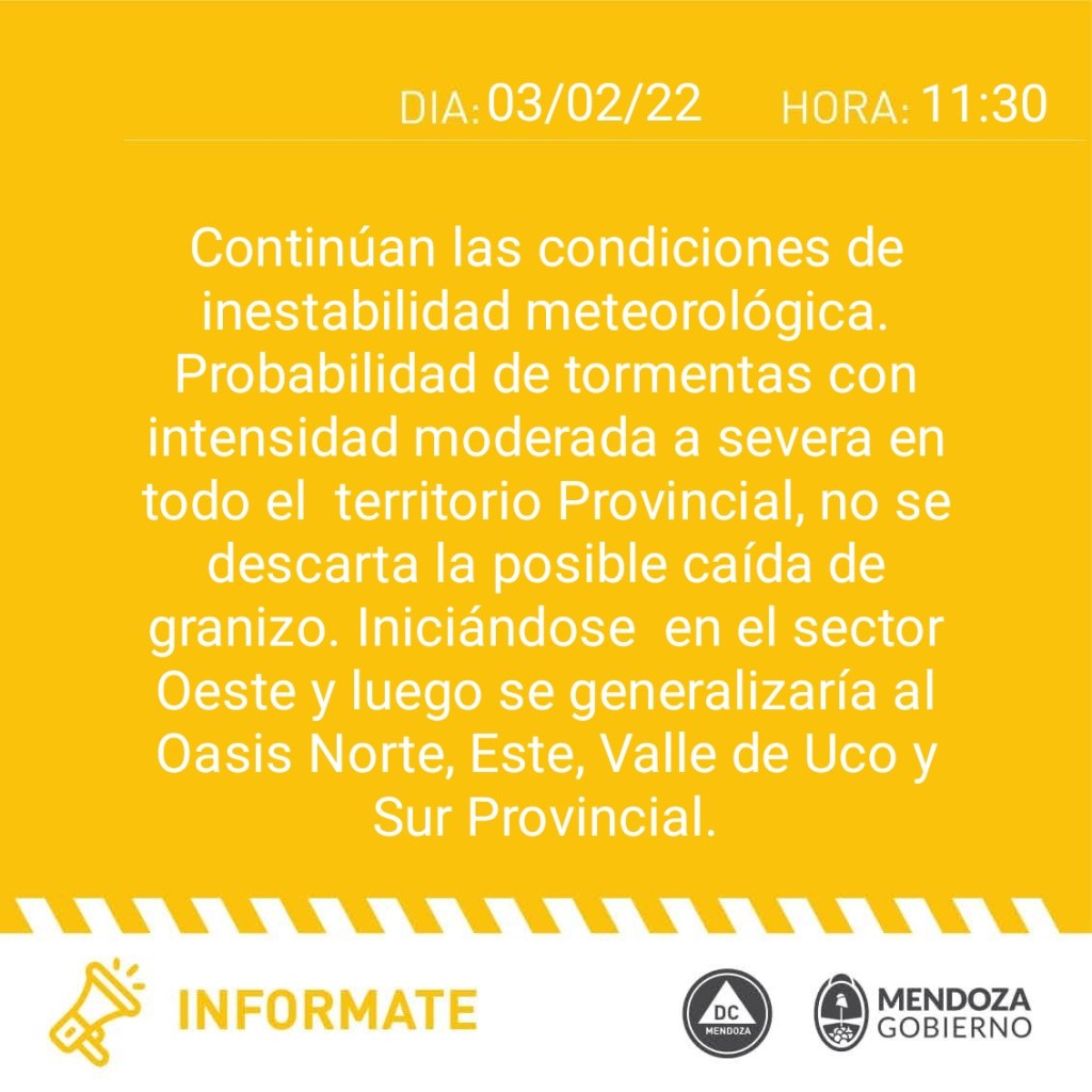 Al igual que el miércoles, se estima que continúe la inestabilidad en Mendoza. El Servicio Meteorológico Nacional emitió (SMN) emitió una alerta amarilla por tormentas fuertes y ocasional caída de granizo. La temperatura para esta jornada oscilará entre los 19 grados y los 32 grados, pero en horas de la noche podrían haber lluvias aisladas.